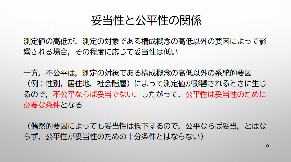 南風原 測定の観点では、「公平」は、より上位の概念である「妥当性」の一部として考えます。つまり、「測るべきものを、きちんと測れているか」ということです。たとえば、本来測りたい力の水準が同じなのに、性別や障害の有無など、測りたいものではない要因によって得点差や合格率の差が出るなら、それは妥当性が低い。そういう意味で、「公平でない」というのは、妥当性の低さの重要な表れなんです。